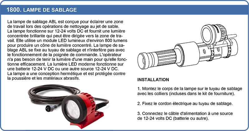 Lampe LED de sablage 800 lumens, 12-24 V DC, cable 1,5m